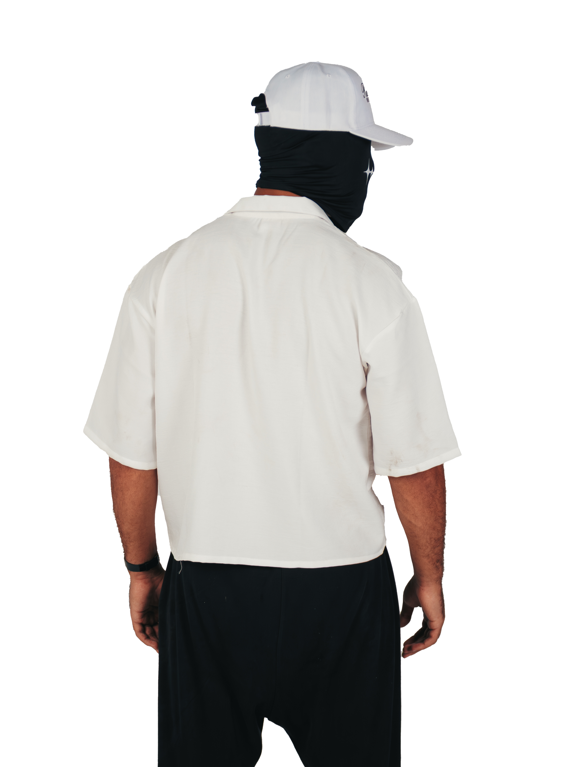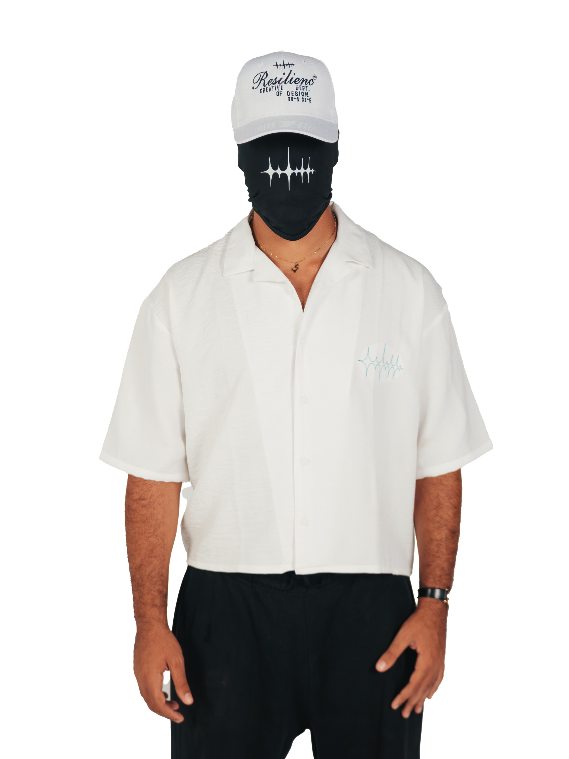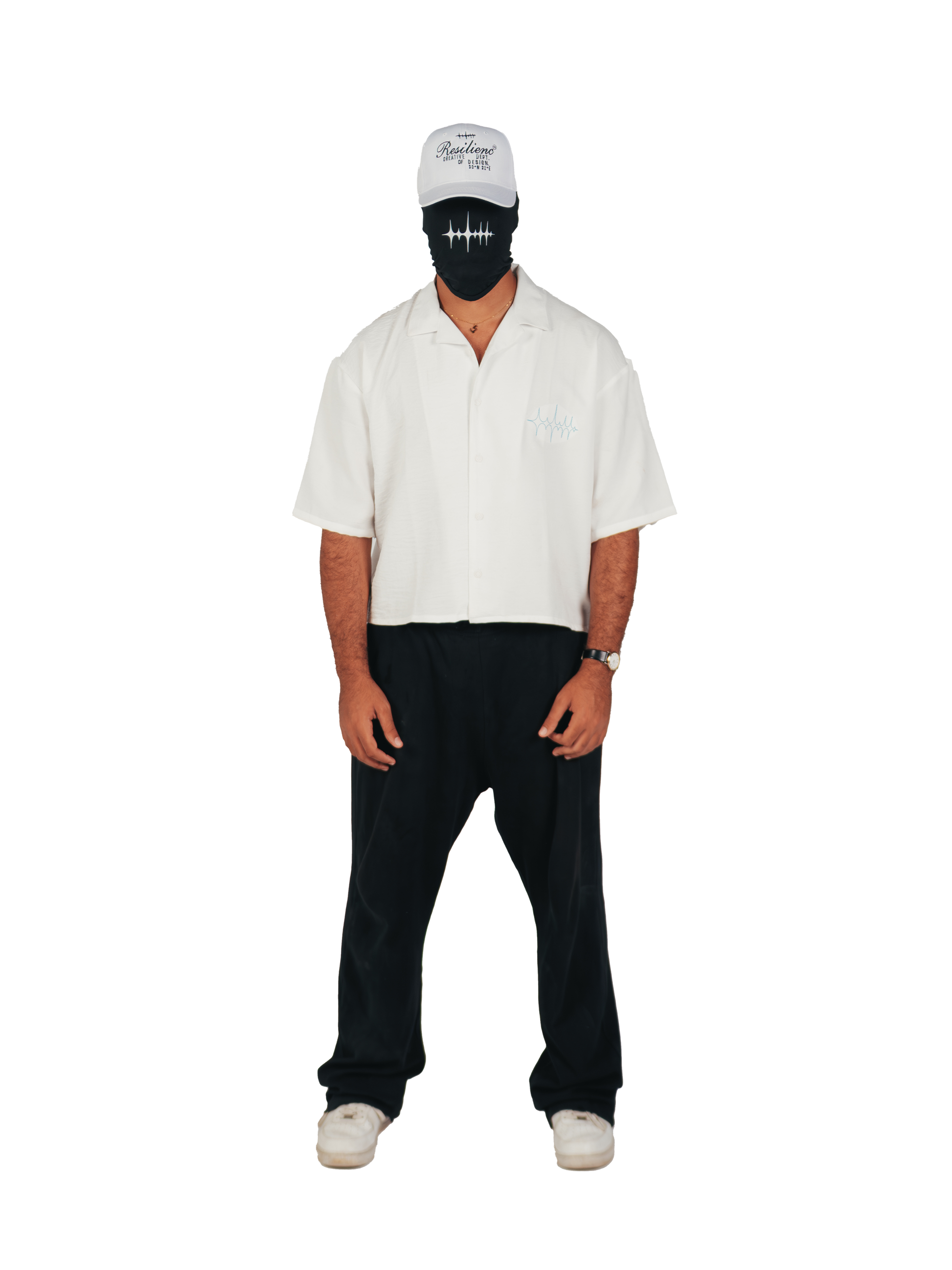 Boxy-cut white linen shirt with clean blue embroidery over the chest. Airy, structured, and easy to layer — sharp lines meet soft texture.