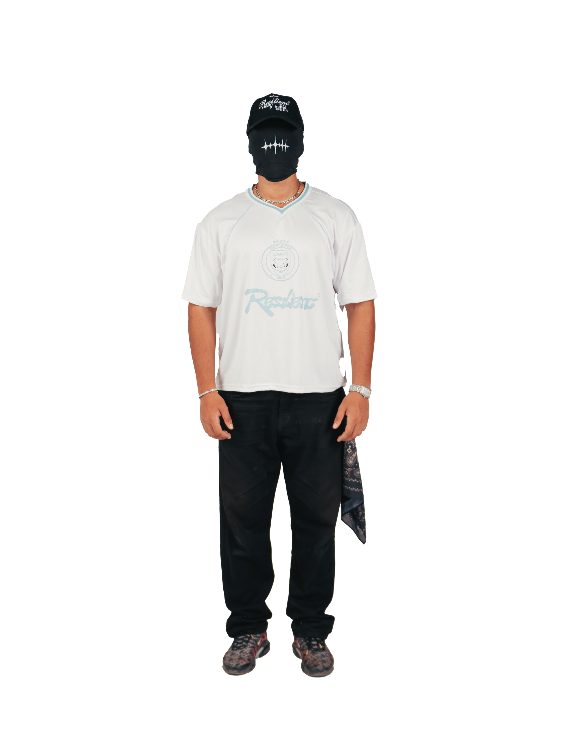 Oversized white jersey in smooth polyester with an electric blue screen-printed design. Built to stay light under the sun, with a relaxed drape and street-ready presence.